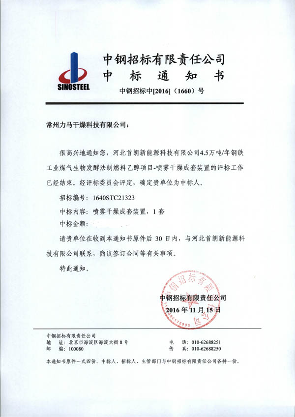 經過公開招標,首鋼公司發酵廢液的深化處理,轉化成蛋白飼料用特大型噴霧干燥機組,^終定標,在眾多的參與投標的入圍企業中,力馬企業一舉中標,中標金額巨大。